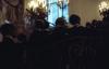 Boys in dark sweaters and collared shirts walking down an indoor staircase with a clergy member