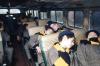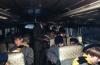 Boys wearing striped scarves and tweed coats sleeping on a bus