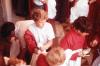 Boys wearing vestments and a clergy member outside in courtyard of Zwettl Abbey monastery in Zwettl, Austria