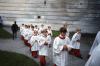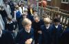 Group of boys wearing blue overcoats walking outside with a clergy member