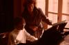 Boy wearing white turtleneck and wire rim glasses at piano with brown haired lady