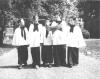 5 boys walking outdoors wearing white choir robes with black bow ties