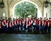 Boys wearing red vests posing by the Grand Staircase of Albemarle mansion