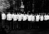 Group photo of boys wearing white turtlenecks on the grounds of Albemarle mansion